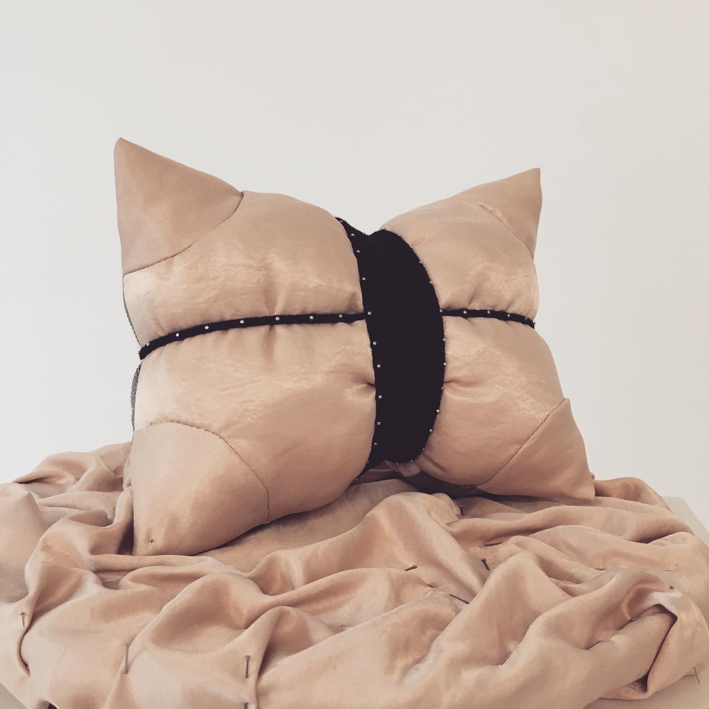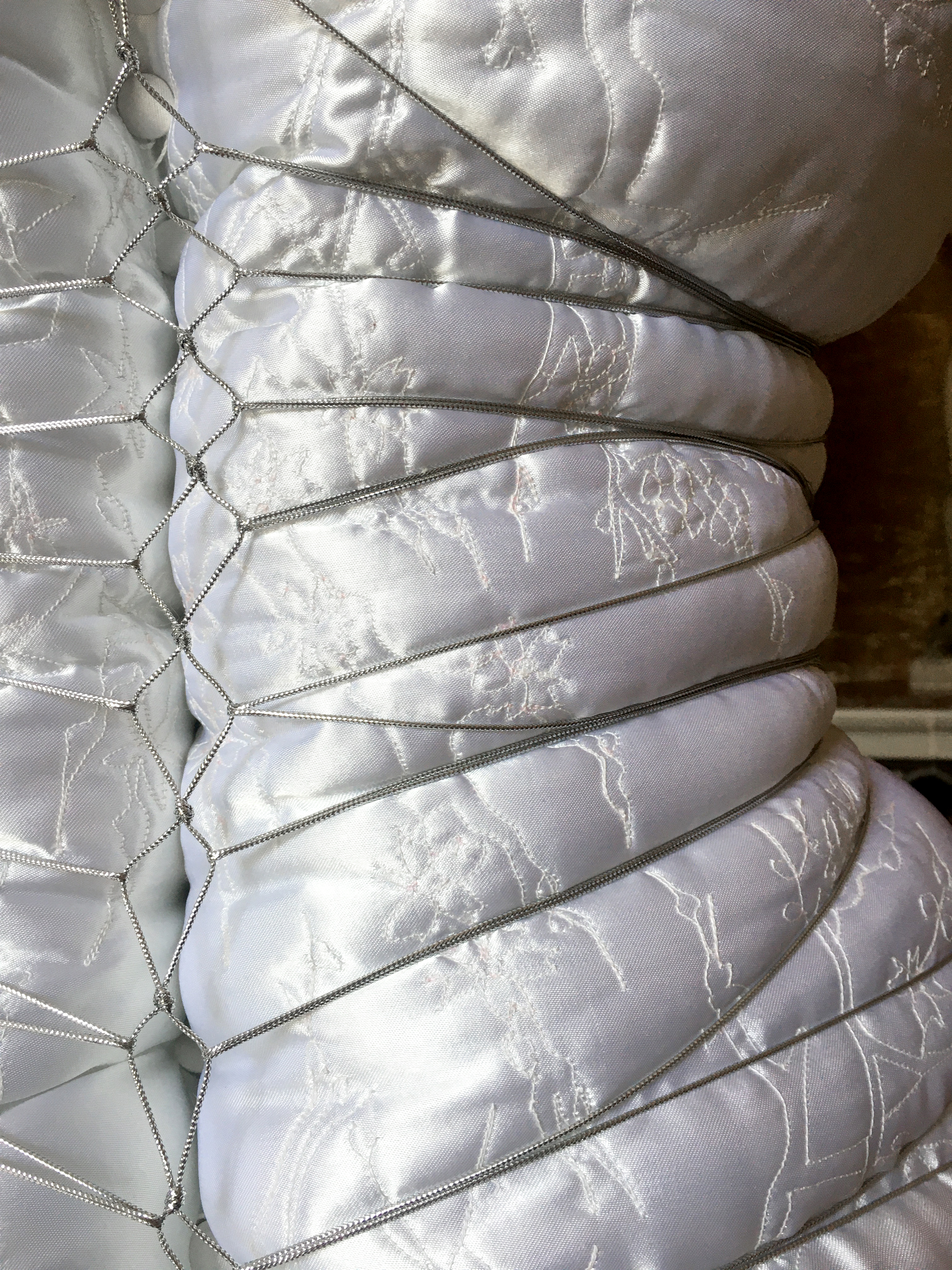 « Le fauteuil Barbara, initialement conçu par l’architecte et designer Jean-Philippe NUEL pour la Maison Duvivier Canapés, se voit interprété par l’artiste plasticienne Pauline ANGOTTI. Cette pièce exceptionnelle incarne la rencontre entre l’expertise de Duvivier Canapés et une vision artistique audacieuse. La soie nouée et les cordes sculptant le volume évoquent l’esthétique raffinée du Shibari japonais. Associées aux broderies précieuses de l’artiste, elles transforment ce siège en une véritable œuvre d’art unique. »