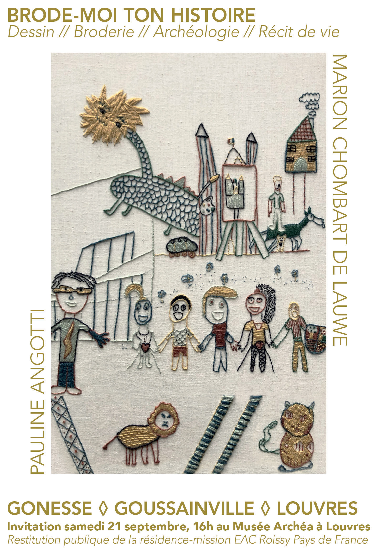 Le projet conçu par les artistes pluridisciplinaires Pauline Angotti et Marion Chombart de Lauwe s’engage dans une exploration du patrimoine architectural, historique et culturel des villes de Gonesse, Goussainville et Louvres, tout en plongeant dans l’intimité et l’héritage personnel des habitants. La résidence donne vie à une grande fresque textile à travers différents ateliers (dessin, scénarisation, broderie). Brodé aux points de tige et aux points de Bayeux principalement, l’ouvrage fait directement référence à la tapisserie de Bayeux. Inspirées des méthodes d’anthropologie, les artistes se sont appuyées sur des thématiques concrètes pour élaborer des ponts entre le particulier et le collectif. Ce projet est une exploration artistique à travers une archéologie du présent.