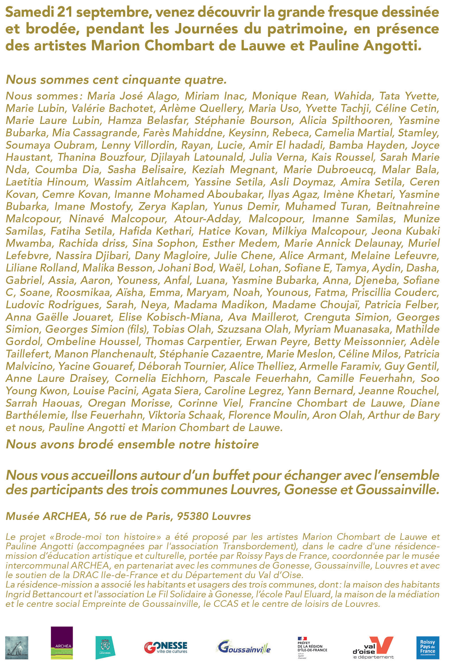 La résidence-mission d’éducation artistique et culturelle intitulée « Brode-moi ton histoire » portée par Roissy Pays de France et coordonnée par le Musée intercommunal Archéa, en partenariat avec les communes de Louvres, Gonesse, Goussainville et avec le soutien de la DRAC Ile-de-France et du Département du Val d’Oise, a associé les publics et usagers des structures locales des trois communes, parmi lesquelles : Maison des habitants Ingrid- Betancourt de Gonesse, la classe de CE2 de Mme Bod de l’école Paul Eluard de Goussainville, le centre social Empreinte de Goussainville, le centre de loisirs et le CCAS de Louvres.
