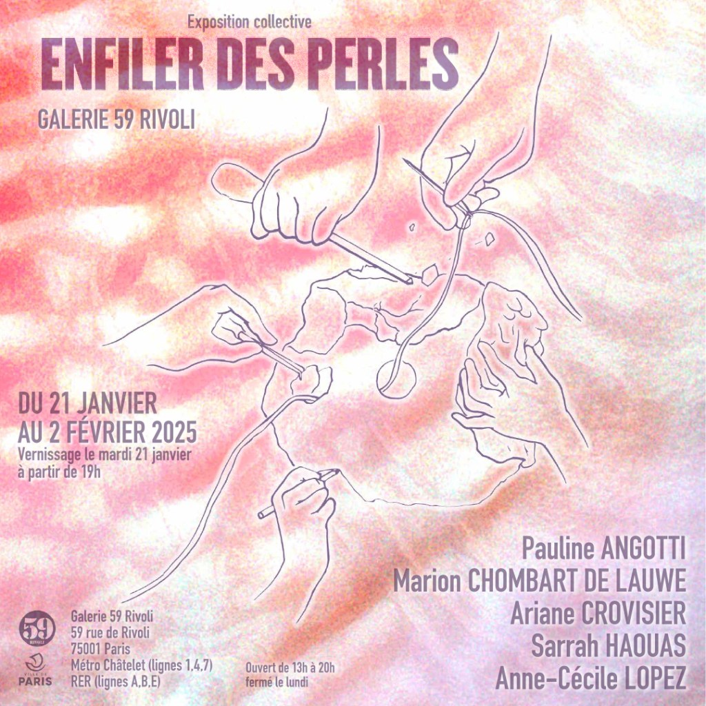 L’exposition collective Enfiler des perles réunit cinq artistes pluridisciplinaires explorant le lien entre Art et Artisanat, en mettant en lumière la vie des femmes artistes et travailleuses. À travers des œuvres textiles, sculpturales, lithiques et gravées, l’exposition fait voler en éclat le sarcasme exprimé par cette expression employée pour dévaloriser l’Action artistique. L’exposition invite les visiteurs à réfléchir sur les récits intimes des femmes, la circularité de la vie et les traces que nous laissons derrière nous, créant un écosystème artistique allant du macroscopique au microscopique.